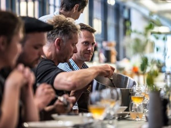 **Dyst i køkkenet med kolleger. teambuilding med mad, samarbejde og smag** Alle er i sving i køkkenet, når der fyres op under vindermentalitet og perfektion, inden I mødes om langbordet og nyder hinandens bidrag til en fælles udsøgt middag med nogle af sæsonens bedste økologiske råvarer, med en særligt afstemt vinmenu eller øl, most og kombucha til. Køkkenchefen er smagsdommer og udnævner vinderholdet, der kan gå fra aftenen med en boblende og velsmagende gave under armen. Pris: fra 1695 kr. ekskl. moms pr. person\ \ \ **Forslag til teambuildingprogram** - Kl. 17:00 - 17:30: Vi byder velkommen med bobler, snacks og intro til programmet. - Kl. 17:30 - 19:00: Vi går sammen i køkkenet og skaber i samarbejde en vidunderlig 4 retters menu. - Kl. 19:00 - 21:00: Langbordet er dækket og vi sætter os sammen og nyder en udsøgt middag. - Kl. 21:00: Kokken siger tusind tak for i aften.