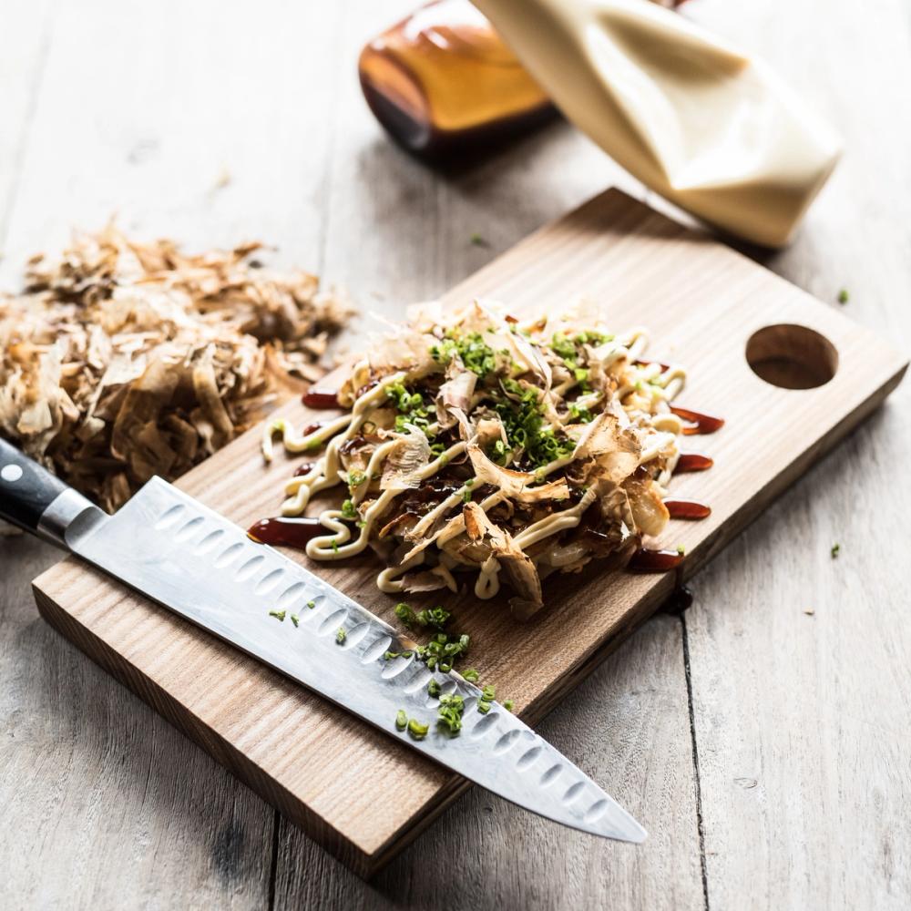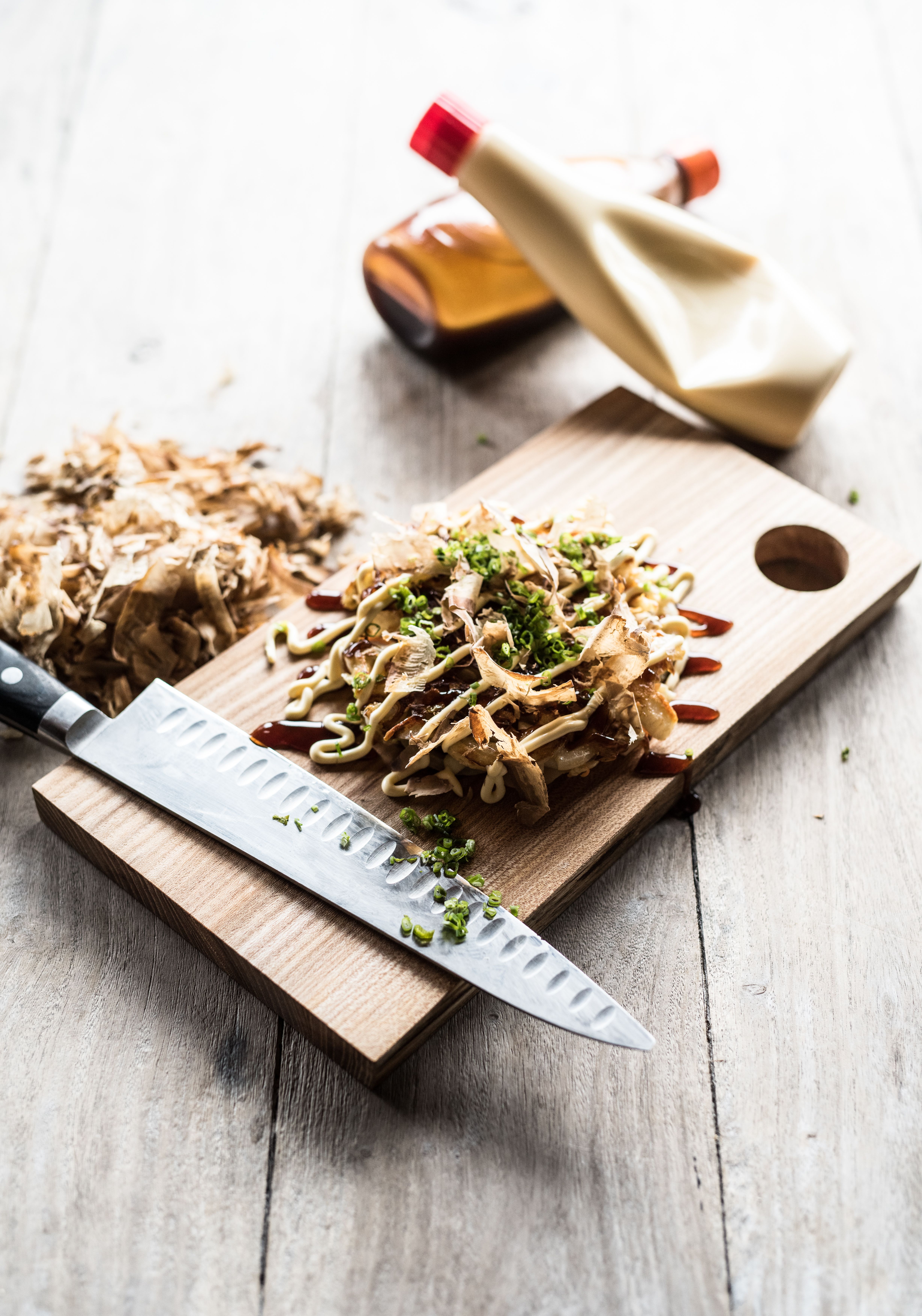 Vi lader sushien ligge og arbejder i stedet med andre fantastisk velsmagende sager som okonomiyaki – en afhængighedsskabende madpandekage, som laves i mange lokale varianter.