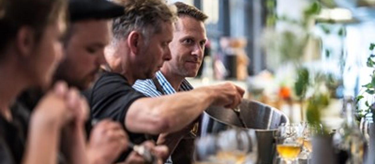 **Dyst i køkkenet med kolleger. teambuilding med mad, samarbejde og smag** Alle er i sving i køkkenet, når der fyres op under vindermentalitet og perfektion, inden I mødes om langbordet og nyder hinandens bidrag til en fælles udsøgt middag med nogle af sæsonens bedste økologiske råvarer, med en særligt afstemt vinmenu eller øl, most og kombucha til. Køkkenchefen er smagsdommer og udnævner vinderholdet, der kan gå fra aftenen med en boblende og velsmagende gave under armen. Pris: fra 1695 kr. ekskl. moms pr. person\ \ \ **Forslag til teambuildingprogram** - Kl. 17:00 - 17:30: Vi byder velkommen med bobler, snacks og intro til programmet. - Kl. 17:30 - 19:00: Vi går sammen i køkkenet og skaber i samarbejde en vidunderlig 4 retters menu. - Kl. 19:00 - 21:00: Langbordet er dækket og vi sætter os sammen og nyder en udsøgt middag. - Kl. 21:00: Kokken siger tusind tak for i aften.