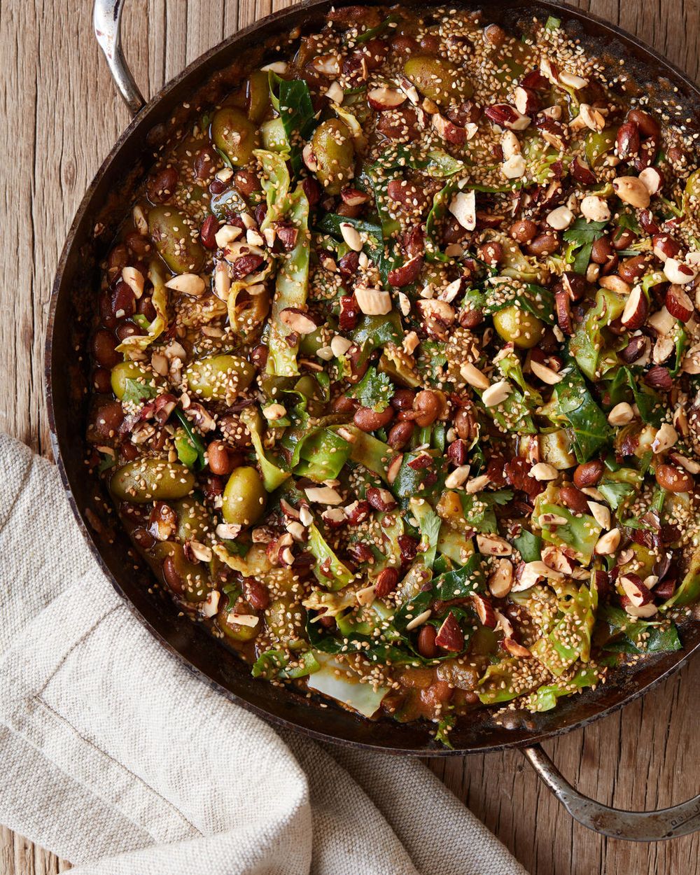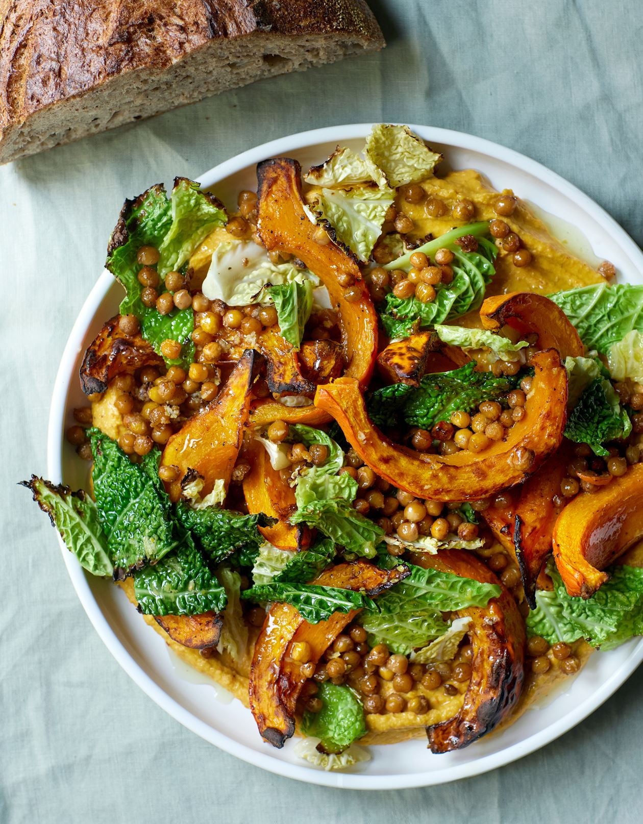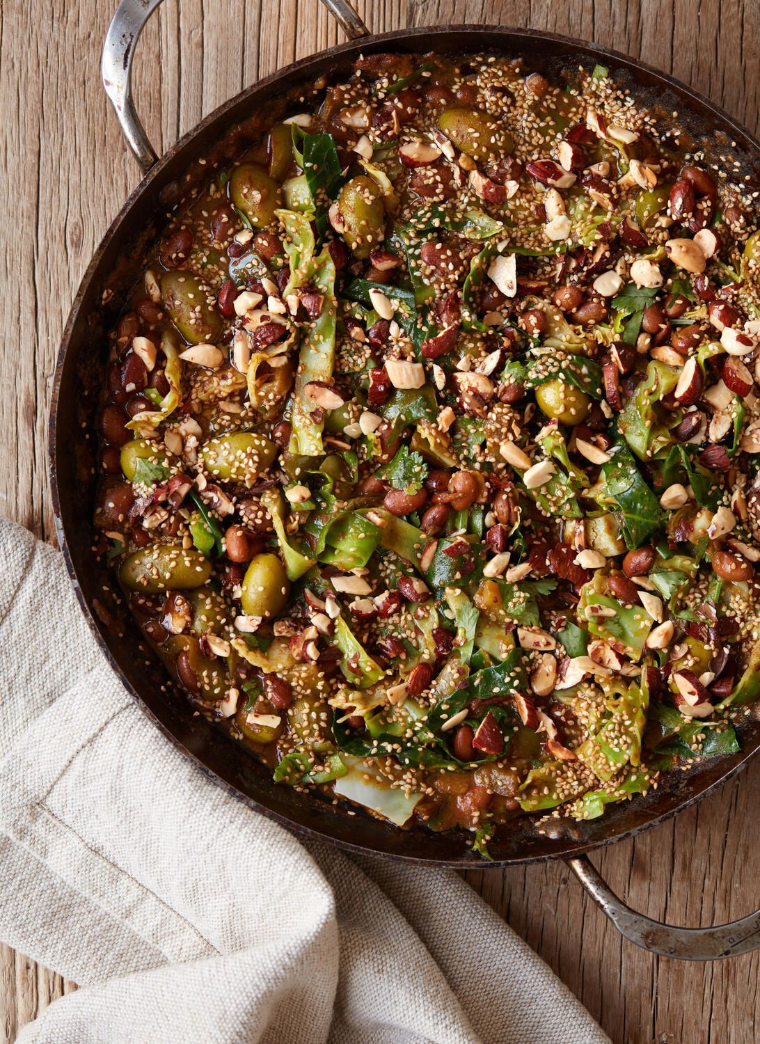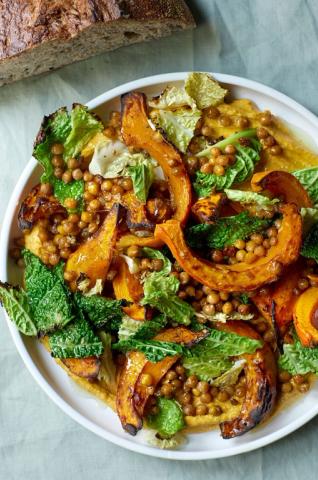 Et overdådigt og farverigt måltid med bælgfrugter i centrum.